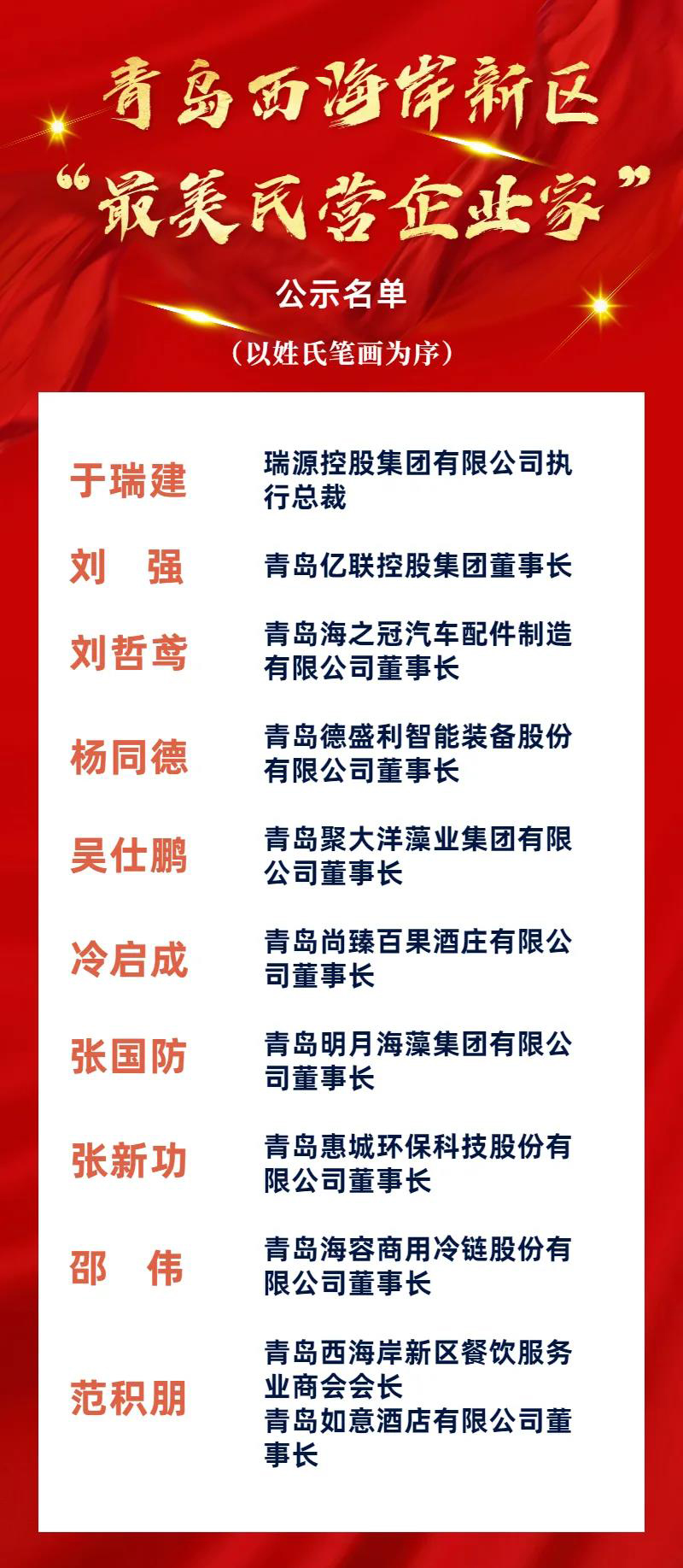 近日,工委区委统战部、工委区委宣传部、区工商业联合会(区民营经济发展局)联合开展青岛西海岸新区“最美民营企业家”评选活动。经过广泛宣传发动、优秀典型推荐、综合评价、联合评分等程序,评选出10名青岛西海岸新区“最美民营企业家”,青岛惠城环保科技股份有限公司董事长、总经理张新功入选。